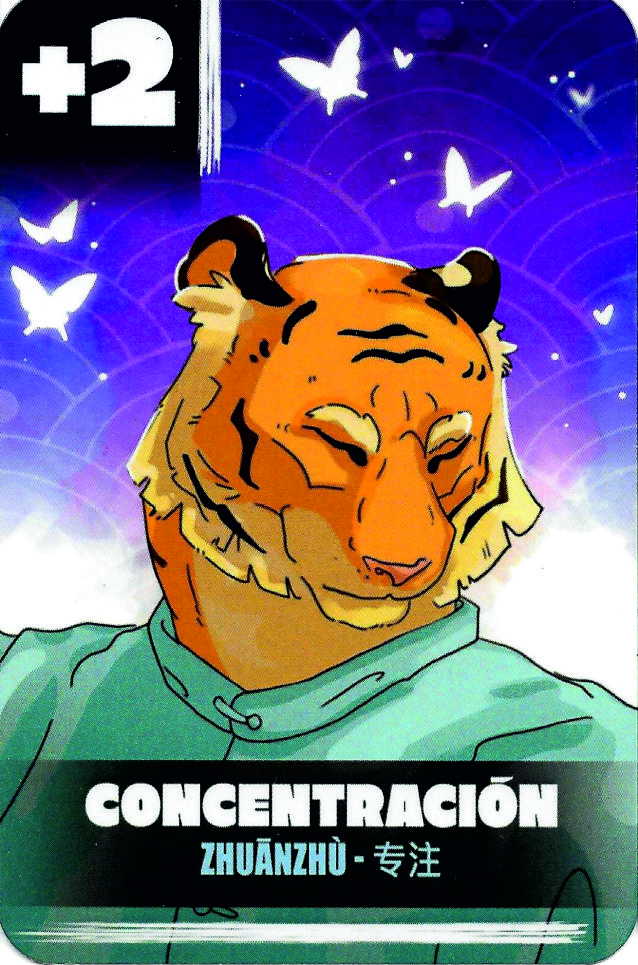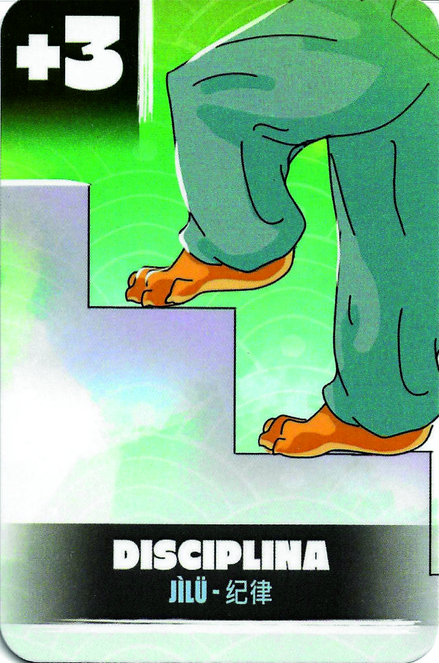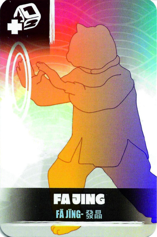 Coloca esta carta en la mesa y tira el dado. Los valores del dado del 1 al 4 indican que puedes robar de 1 a 4 cartas de entrenamiento a los demás jugadores, a un o Si te sale la cruz tu fa Jing no ha sido efectivo y pierdes el turno y no robas la carta de entrenamiento. Si te sale la flecha significa que el Fa Jing se ha vuelto contra ti, pierdes una ficha de energía, si no dispones de ninguna pierdes el turno y no robas la carta de entrenamiento. Una carta de Fa Jing contrarresta esta acción.